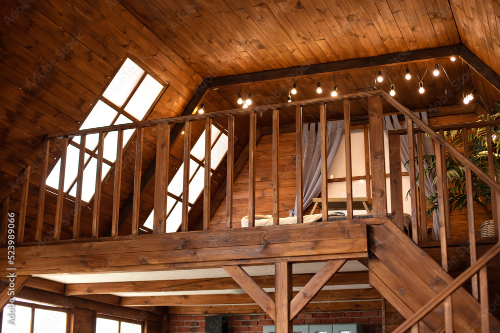 Scandinavian style interior at home. Country wooden house is spacious on two levels. Room with wooden stairway leading to second floor of modern flat. Bedroom with lamp garlands on second floor.