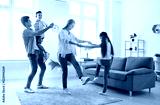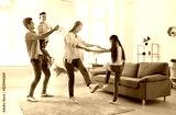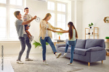 Happy, joyful family having fun at home. Cheerful, carefree mother, father and children spending time in their spacious modern living room, playing games and dancing