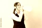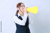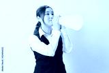 両手でメガホンを持って声援を送る若いOL