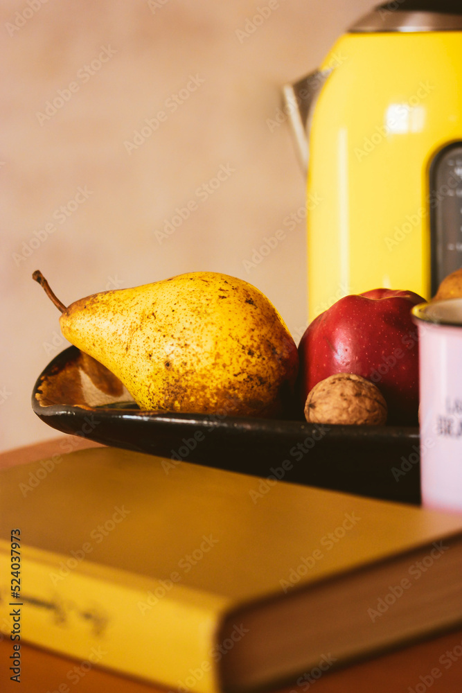 Autumnal still life: pink cup, yellow teapot, bowl of fruit, hardcover book lying on table. Retro housewares, utensils. Reading in cozy sweet home atmosphere. Lifestyles concept. Vertical background.
