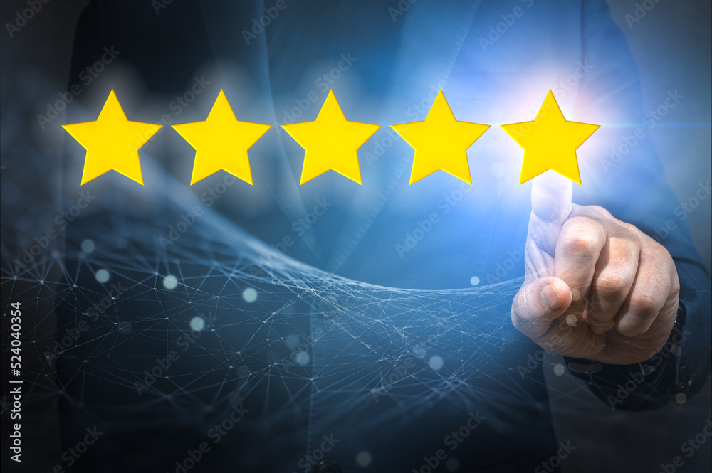 Businessman pointing five star symbol to increase rating of company. Customer satisfaction and product service evaluation concept. Increase rating