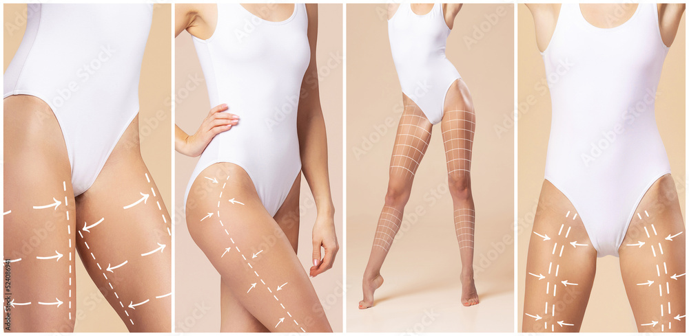 Beautiful and fit female body with the drawing arrows. The concept of Plastic surgery, healthy nutrition, liposuction, sport and cellulite removal.
