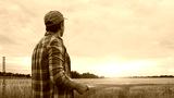 Farmer with a tablet computer in front of a sunset agricultural landscape. Man in a countryside field. Country life, food production, farming and technology.