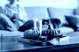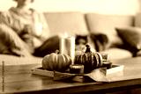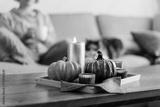 Autumn, fall cozy mood composition for hygge home decor. Small pumpkins, burning candles on tray with gray napkin on the coffee table with resting woman with cat in the living room. Selective focus