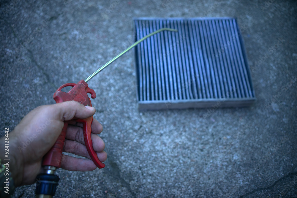Purging of the car filter using a compressor. Cleaning the air filter with your own hands. The hand holds the air gun from the compressor.