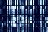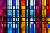 Colorful stained glass window in modern design with blue, red, violet and yellow pieces of glass