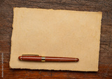 sheets of blank handmade paper with rough edges and a stylish pen against rustic weathered wood