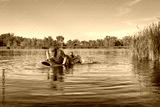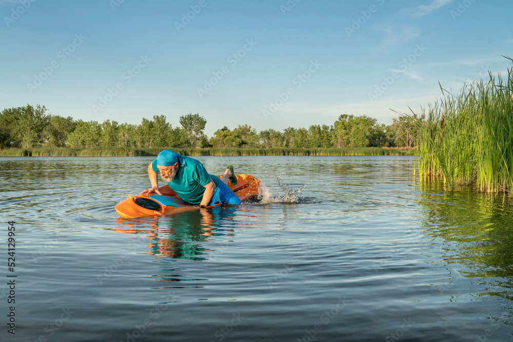 athletic, senior man is boarding a prone kayak on a lake in Colorado, this water sport combines aspects of kayaking and swimming