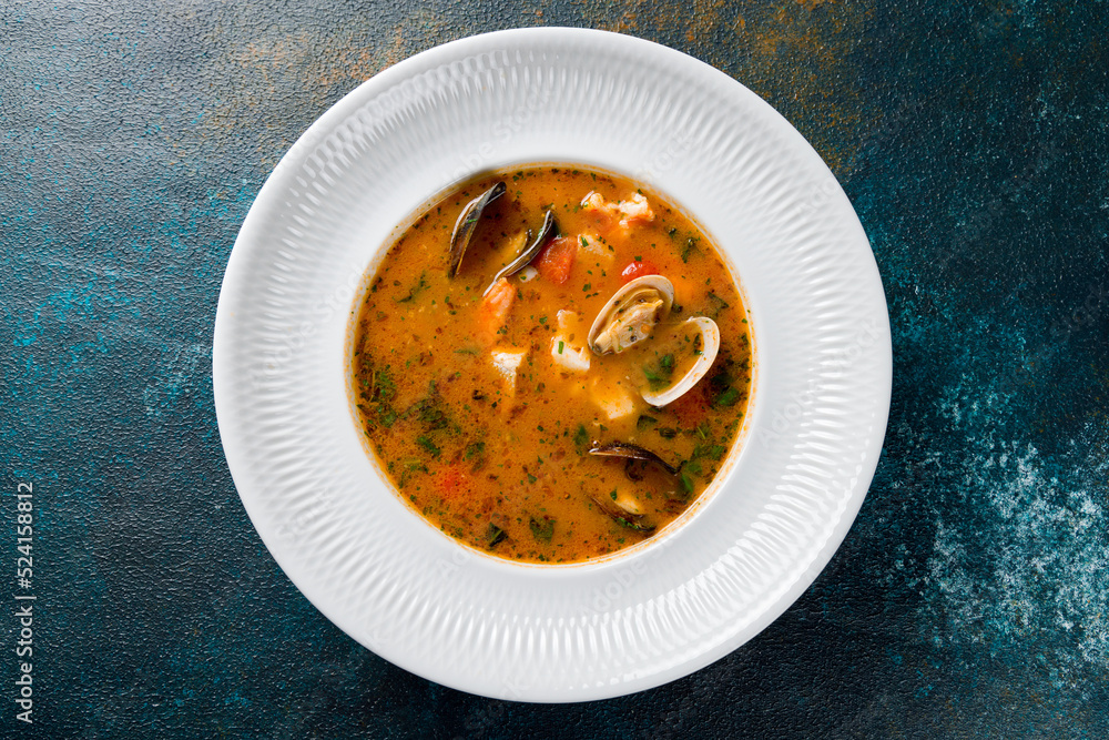 Marseille fish soup with seafood on white plate on dark blue table top view