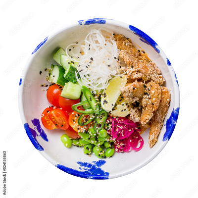 Poke with chicken, rice, cucumbers,tomatoes,lime,edamame and caramelised onion on bowl isolated on white background top view