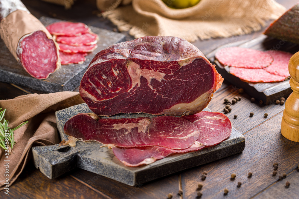Spanish Jamon (Hamon) on the board sliced on dark wooden table and other italian sausage