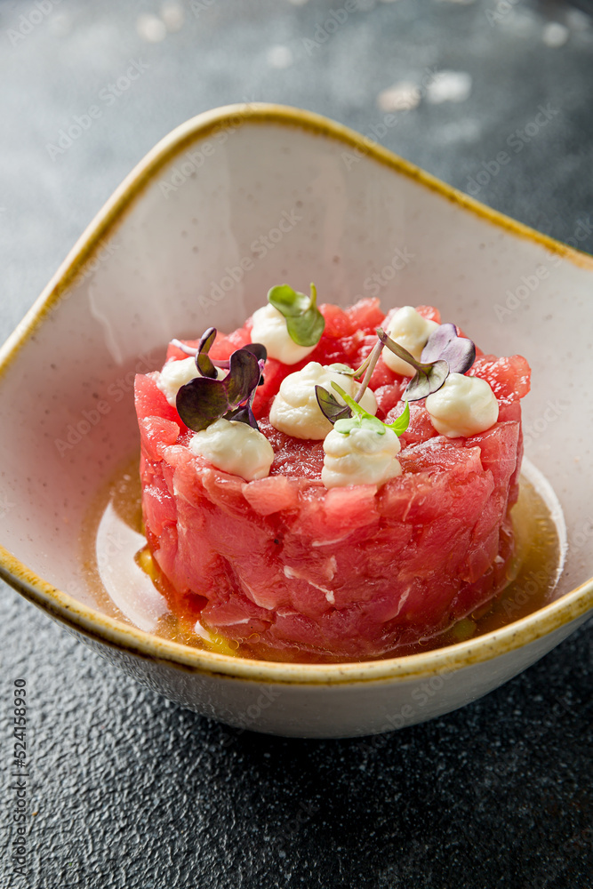 Tuna tar tar with avocado and cream cheese macro close up, vertical