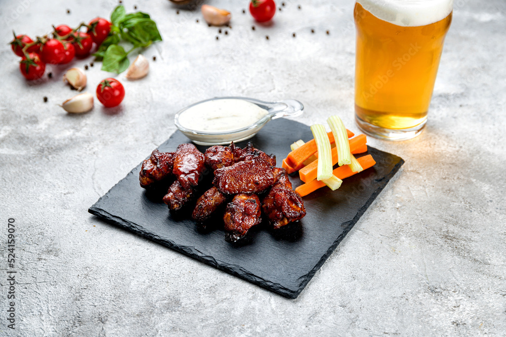 Chicken wings with blue cheese sauce and bbq sauce on black stone plate with beer on grey table