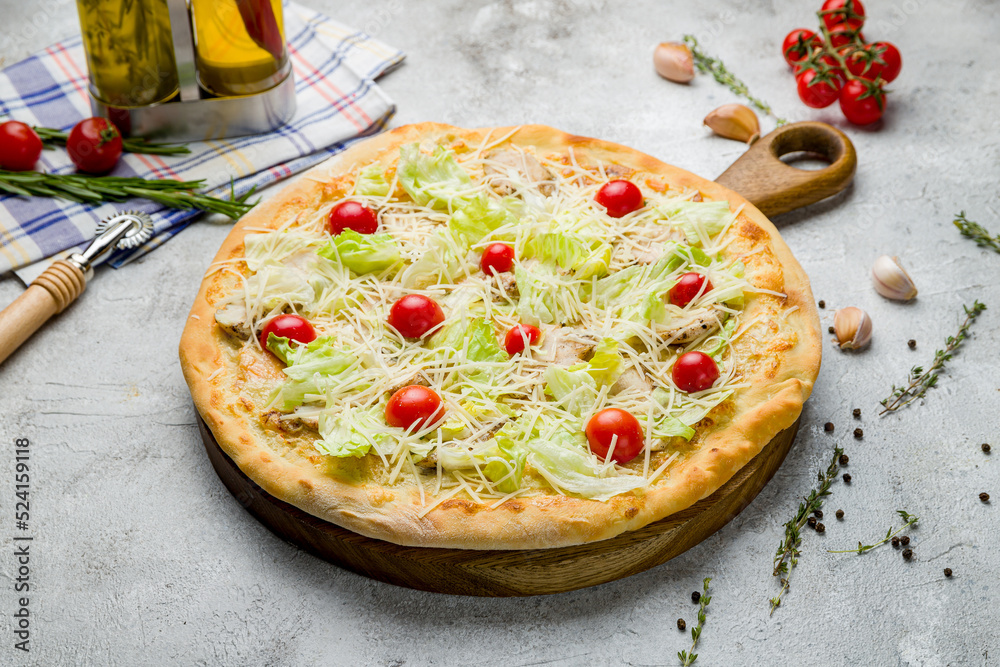 Pizza Caesar with chicken, salad and tomatoes with parmesan on board on grey table