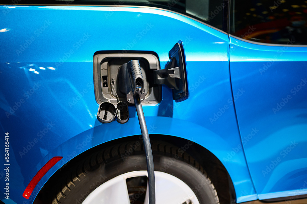 Charging electric automobile with plug at power station