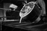 Pouring red liquid silver from bucket in induction oven