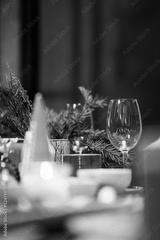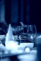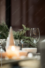 dishes and fir branches on the festive table, christmas and New Year's concept, interior details, selective focus