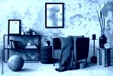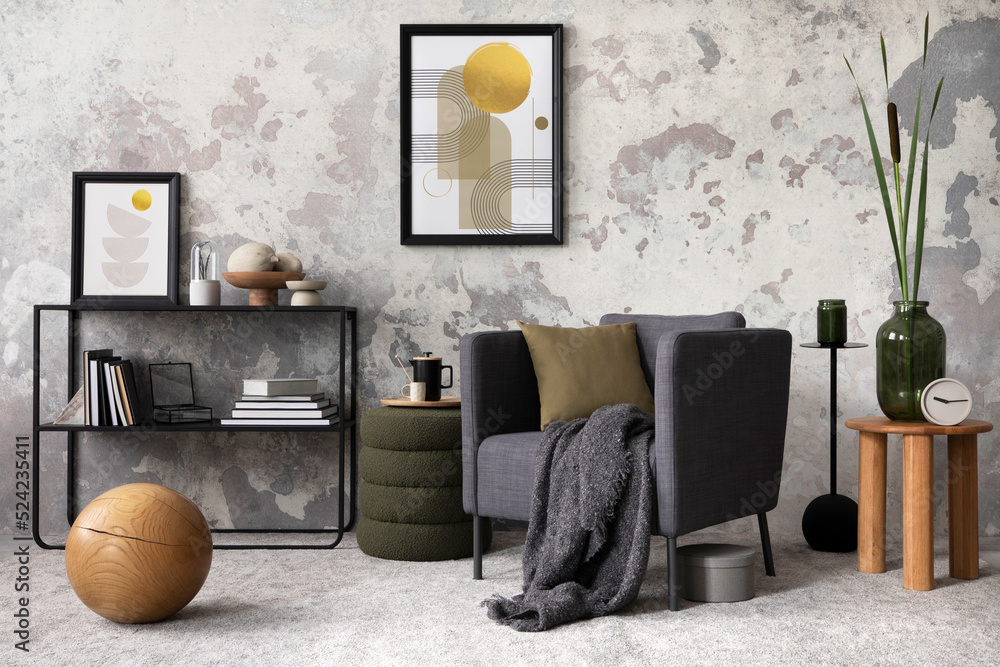 Loft style of modern apartment with grey armchair, black design shelf, mock up poster frame, decoration, carpet, lamp and personal accessories. Minimalist home decor. Template. Grunge concrete wall.