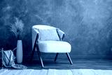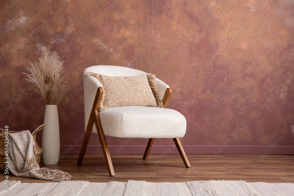 Interior design of aesthetic and minimalist room with white boucle armchair, vase with dried flowers and personal accessories. Stylish home decor. Template. Copy space. Grunge wall.