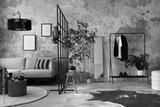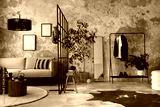 Exquisite and modern composition of living room interior with design grey sofa, bench, plant, brown coffee tables, decoration, pillow and elegant accessories. Concrete grunge wall. Template.