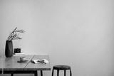 Creative composition of cozy office interior with black chair, wooden table, cup of coffee, copy space and personal accessories. Home decor. Template.