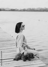 Brunette woman sitting on pier with her redhead dog toy poodle