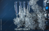 Christmas decorations, silver tinsel and glass goblets on a dark blue background. Christmas and New Year background.