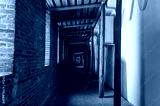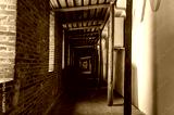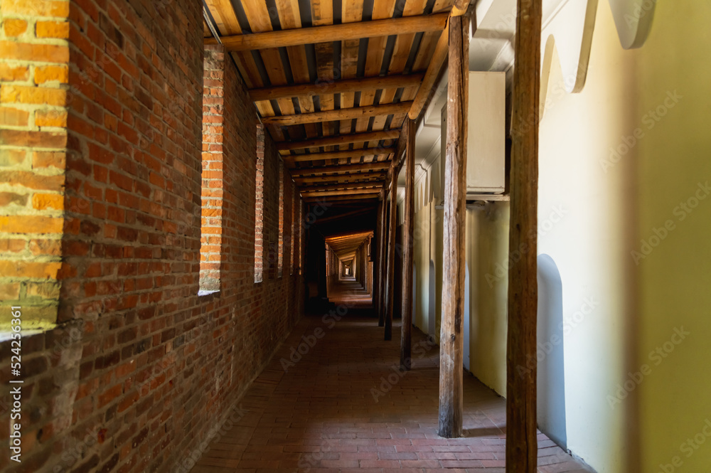 Wooden passage between the towers of the old fortress.d wooden terrace in the old castle.