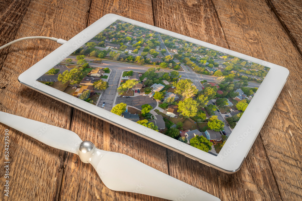 summer sunrise over residential area of Fort Collins in northern Colorado, reviewing an aerial image on a digital tablet
