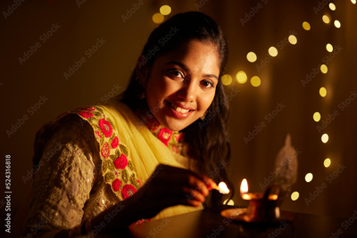 Beautiful Hindu Indian young women lightening deepa on Diwali day.