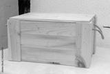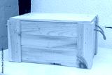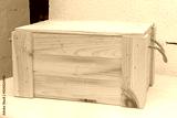 Wooden box made of planks with a rope handle for storing and transporting objects on a textured light background.
