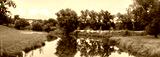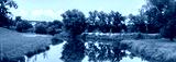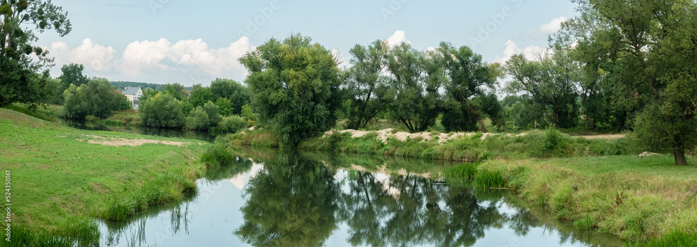 Rzeka Osobłoga w tle lekko pochmurna pogoda, błękit nieba zieleń przy brzegu, pora letnia, Osobłoga w odcinku województwa Opolskiego