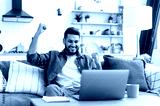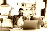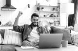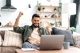 Amazed excited arabian or indian man, freelancer, sits on a sofa in living room, looks at laptop screen, gesticulating with hands, celebrates success, rejoice in big profit, received good news, smiles