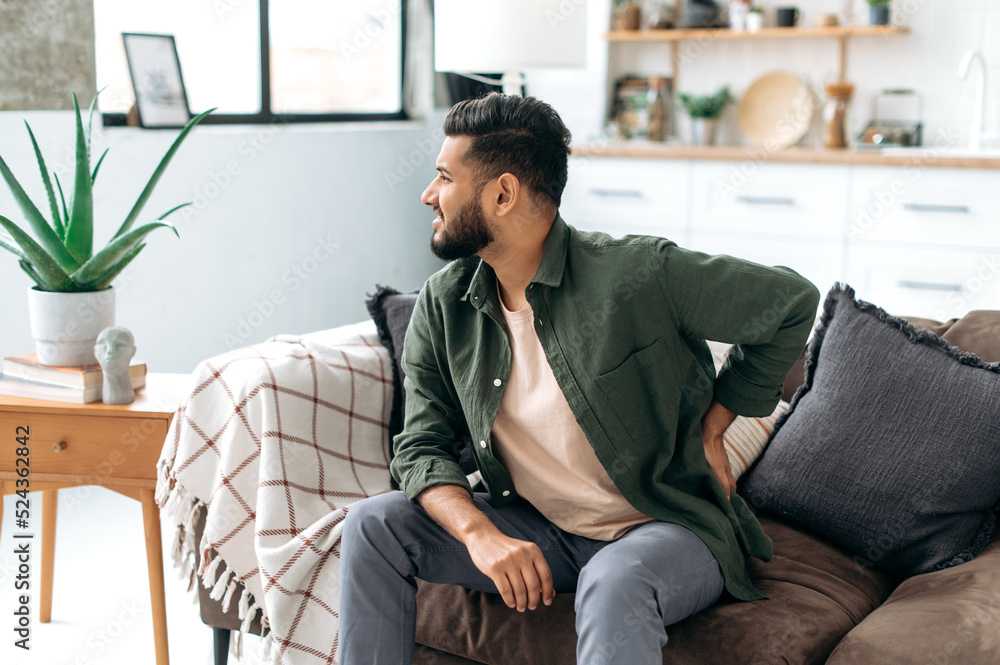 Problems with the back, spine, sciatica. Sad Arabian or Indian man, dressed in casual wear, sitting on sofa in living room, experiencing acute pain in the back, lower back, has chronic joint problems