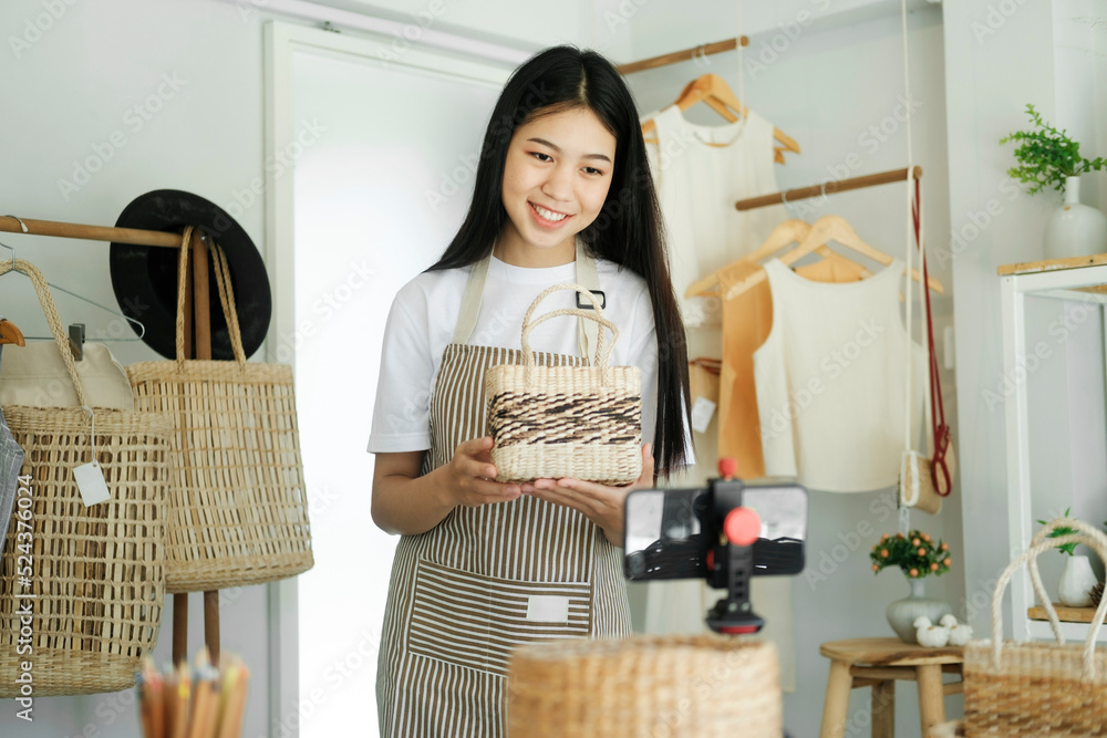 Young asian businesswoman fashion blogger showing woven basket products with smiling.