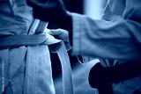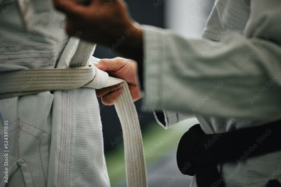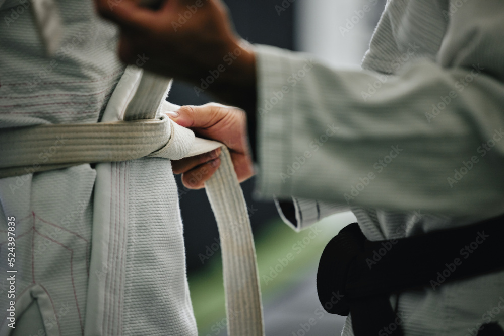 Karate learning, training and workout of a sport student and coach getting ready for a fight class. Defense expert hands tie a belt in a dojo, workout studio or wellness club about to work on fitness