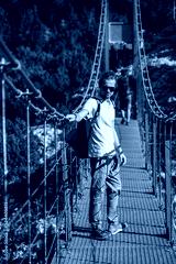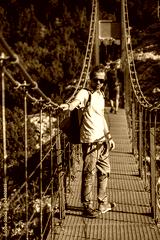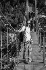 Traveler with a backpack in the mountains. A middle-aged man stands on a suspension bridge on a background of a forest in mountains. Adventure trip to Europe.