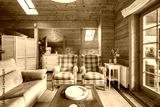 Beautiful interior of cozy living room with sofa and armchairs in a wooden house. Life in a village