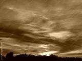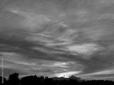 Wieczorne, lekko zachmurzone niebo. Chmury światłem zachodzącego słońca zabarwione są na czerwono. Miejscami widać niebieskie niebo.