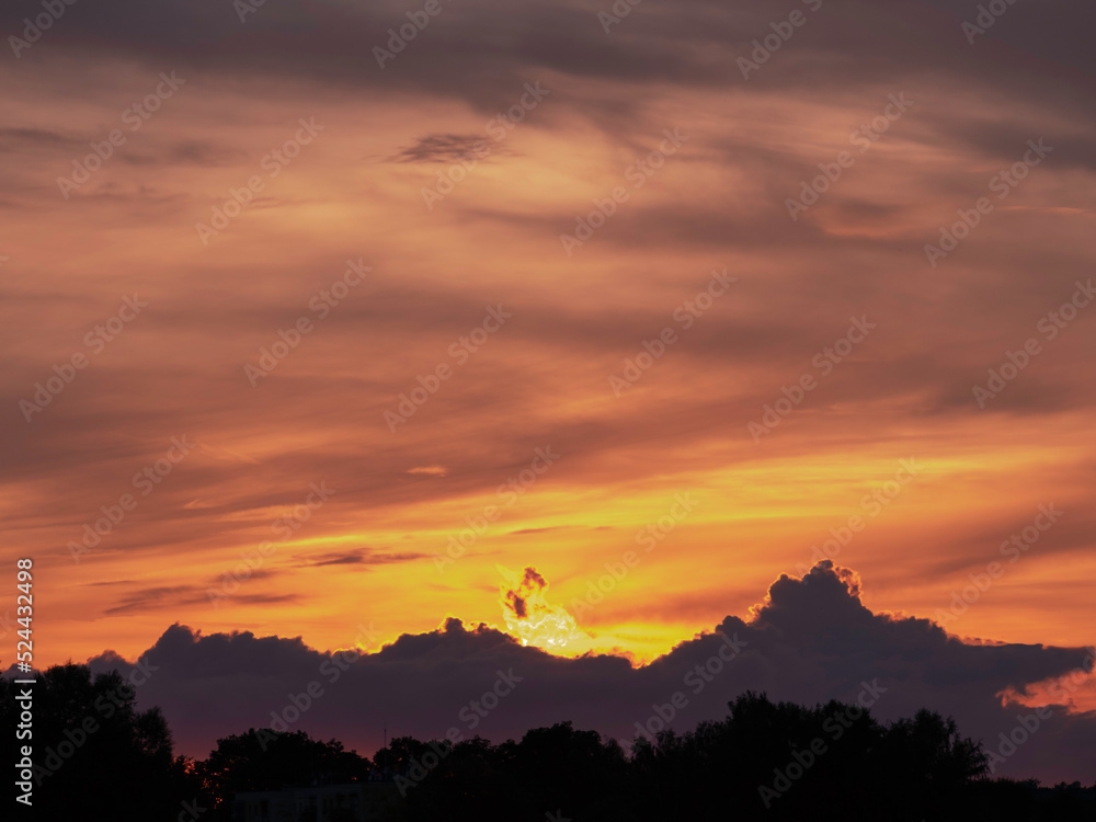Wieczorne, lekko zachmurzone niebo. Chmury światłem zachodzącego słońca zabarwione są na czerwono. Miejscami widać niebieskie niebo.