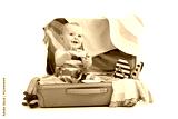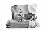 Baby girl sitting in suitcase with things for vacation travel