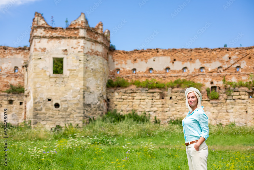 Tourist Ukraine. A tourist girl near the wall of Castle in Stare Selo, Ukraine