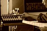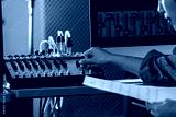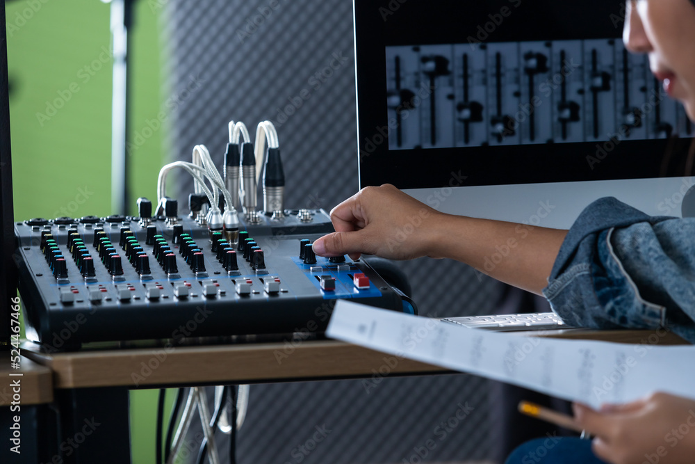 Close-up of Asian woman vocalist Wearing Headphones recording a song front of control desk equipment for sound recording in a professional studio