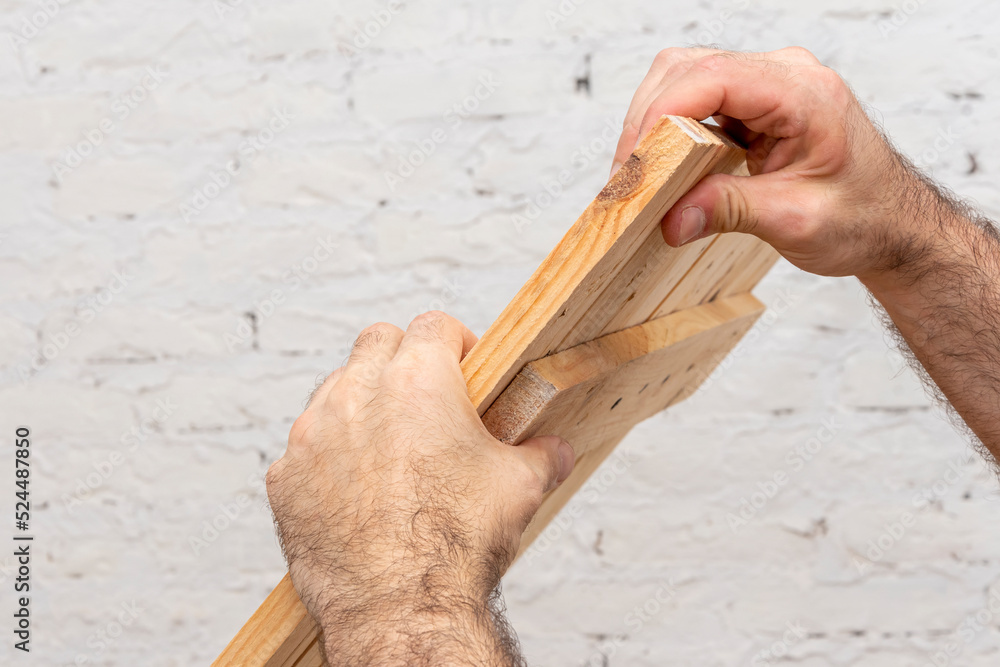 Close-up of a carpenter's hands holding a table made of wooden planks. Concept: home improvement, furniture repair with your own hands.