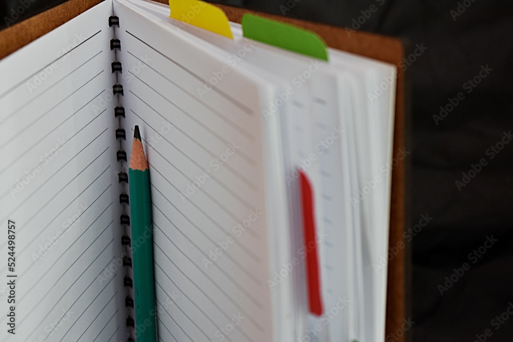 open notebook with springs with blank pages with colorful bookmarks and a pencil. Concept of planning, study, office, business