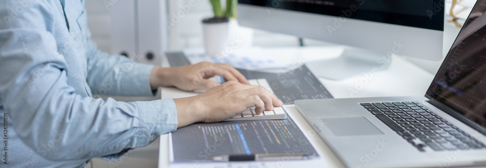 Professional development programmers are sit on a desk with work equipment such as: computer-laptop-tablet. for working in programming or writing code on website, HTML, javascript, Software.