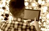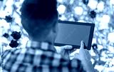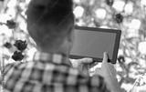 gardening and people concept - close up of man with tablet pc computer and flowers at summer garden