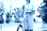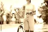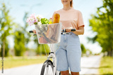 people, leisure and lifestyle - close up of happy woman with food and flowers in basket of bicycle on city street