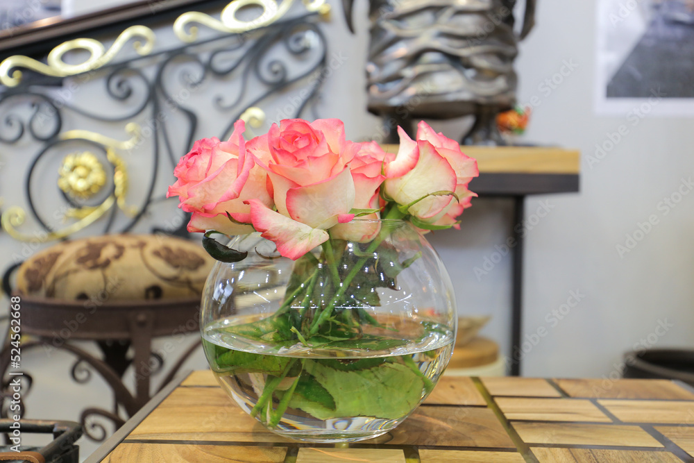 Roses flowers in a round glass vase