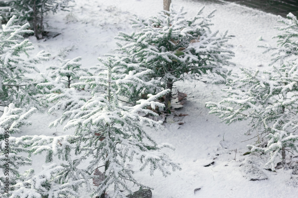 Fir group of little cute Christmas trees with first snow, spruces under snowy flakes, winter onset season